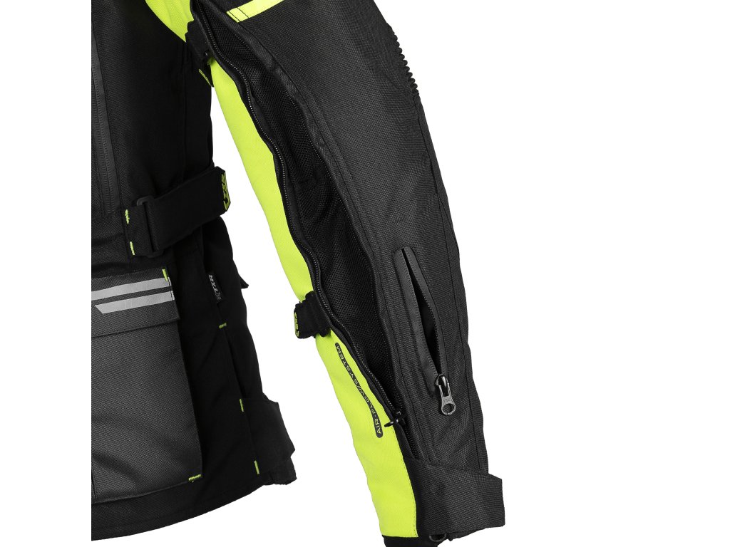 Odnímatelná membrána do nepřiznivého počasí; termo podšívka; chrániče ramen a loktů; reflexní prvky; dokonalé přizpůsobení bundy postavě; krátký zip pro propojení s kalhoty