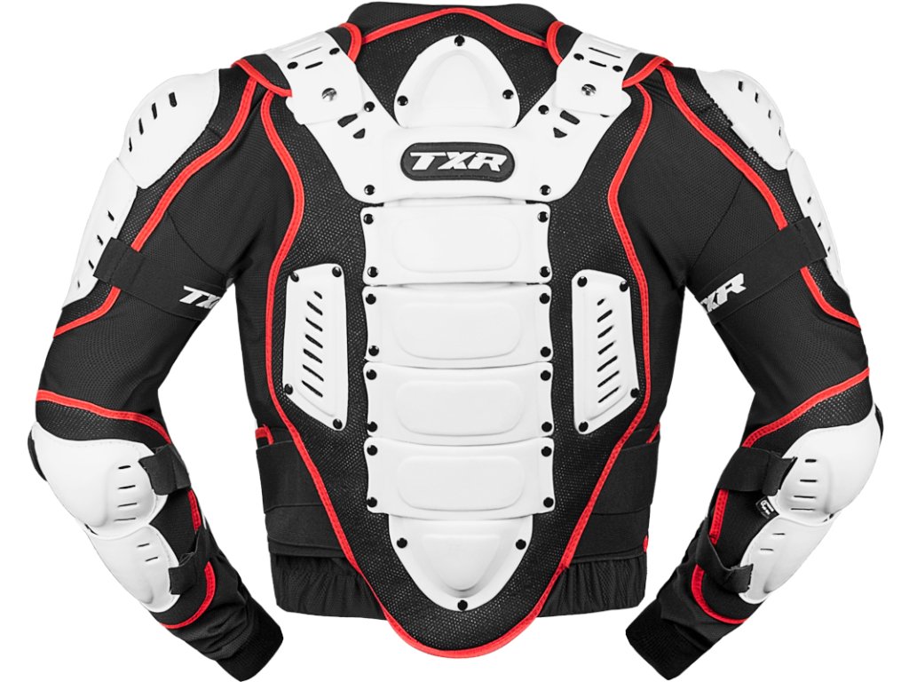 Chránič těla TXR Guard bílo/černo/červený vás kolem dokola horní poloviny těla ochrání. Součástí chrániče jsou plastové CE certifikované chrániče na hrudi, zádech, ramenech a loktech. Kromě samotného chrániče v balení naleznete také protektory klíčních kostí, které velice snadno přiděláte na chránič.