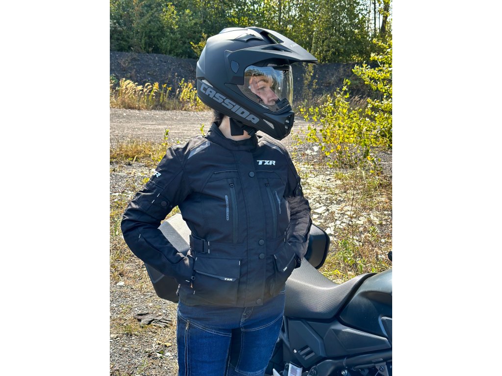Dámská moto bunda TXR Visper černá je vyrobená z materiálu Polyester Textech 600D, který je vysoce odolný proti prodření. V kombinaci s předním YKK zipem a ISO bezpečnostními švy bude vaším oblíbeným společníkem. Součástí bundy je také termo podšívka, která lze v teplejších dnech snadno vyjmout pomocí zipu. Samozřejmostí jsou homologované chrániče loktů a ramen CE Level 1. Moto bunda Visper má v zádové části kapsu pro vložení zádového chrániče model TXR SW-253 vel. S. Samozřejmostí je možnost nejrůznějších úprav pro různé typy postav: