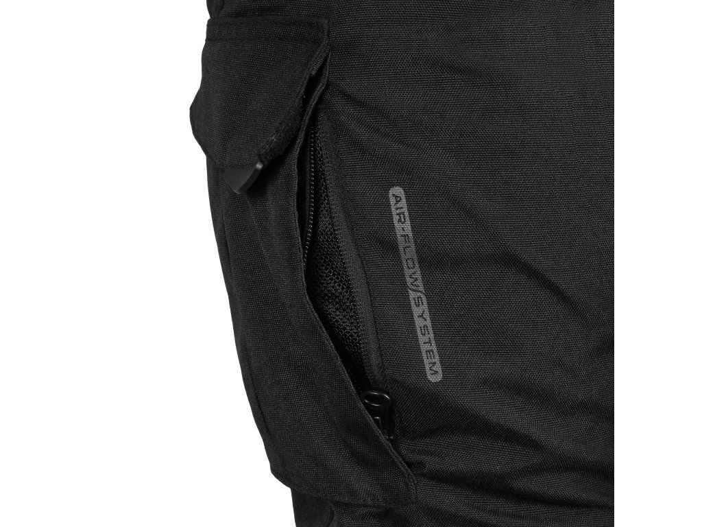 Pohodlí během jízdy na motocyklu podporuje strečový materiál 4 Way Stretch v rozkroku a flexibilní panely nad koleny i na bedrech. Mimo to je sedací část z protiskluzového materiálu. Do chladnějších dnů přijde vhod termo prošívaná podšívka snadno vyjmutelná zipem v případě teplejšího počasí. Pokud by vám bylo horko, po stranách nohavic naleznete ventilační zipy. Poklopec má dvojité jištění (2x patent a suchý zip). Pas je možné si přizpůsobit pomocí stahovacích pásků.