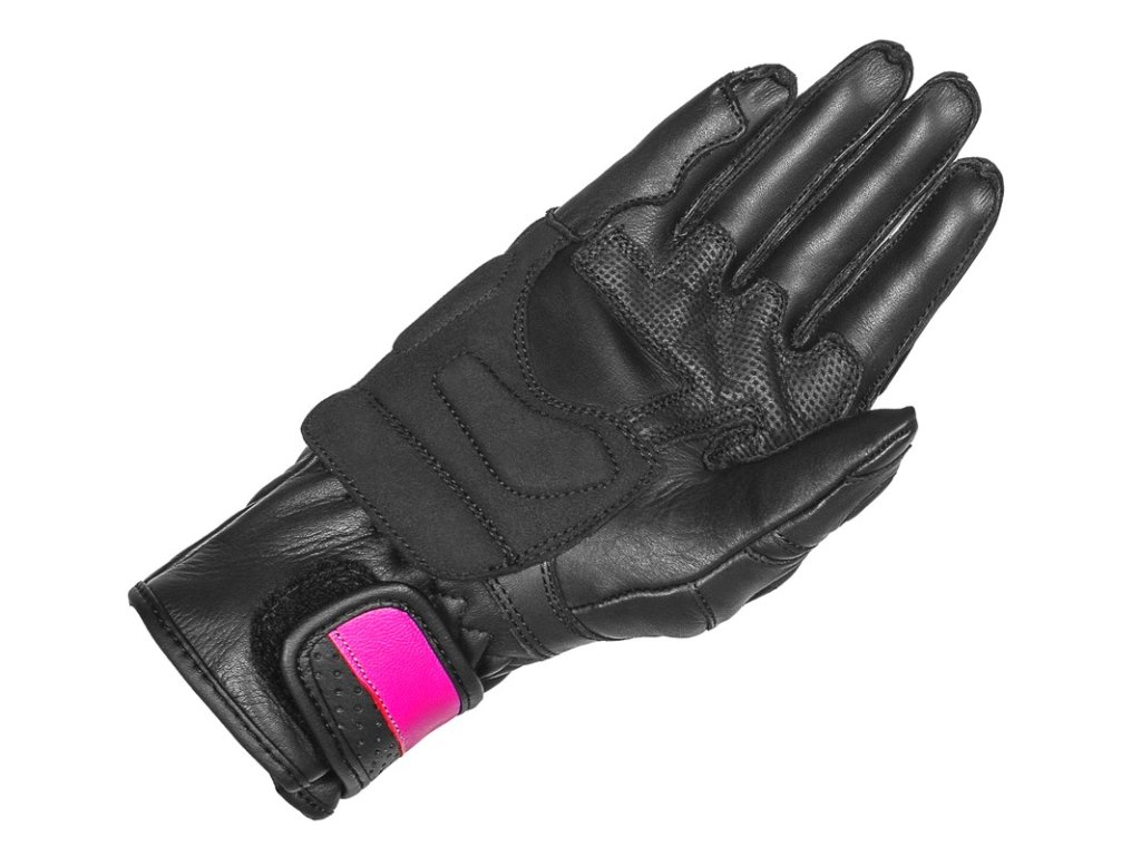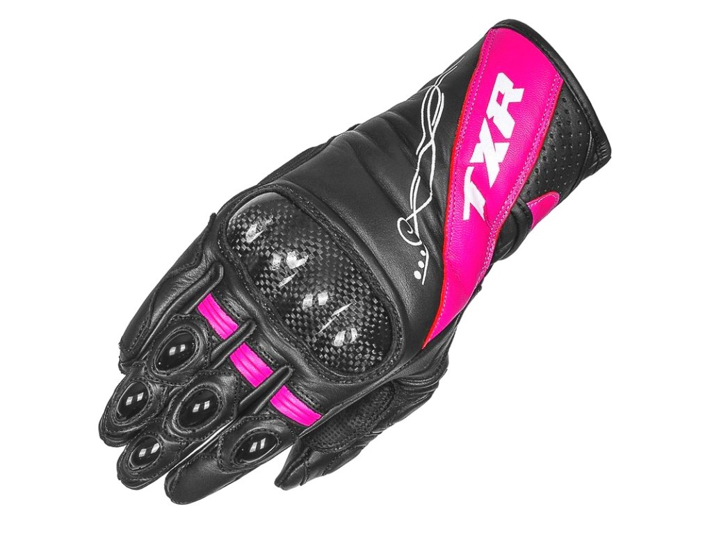 Černo-růžové dámské rukavice na motorku z hovězí kůže. Součástí je karbonový chránič kloubů, plastové chrániče prstů a chránič dlaní.