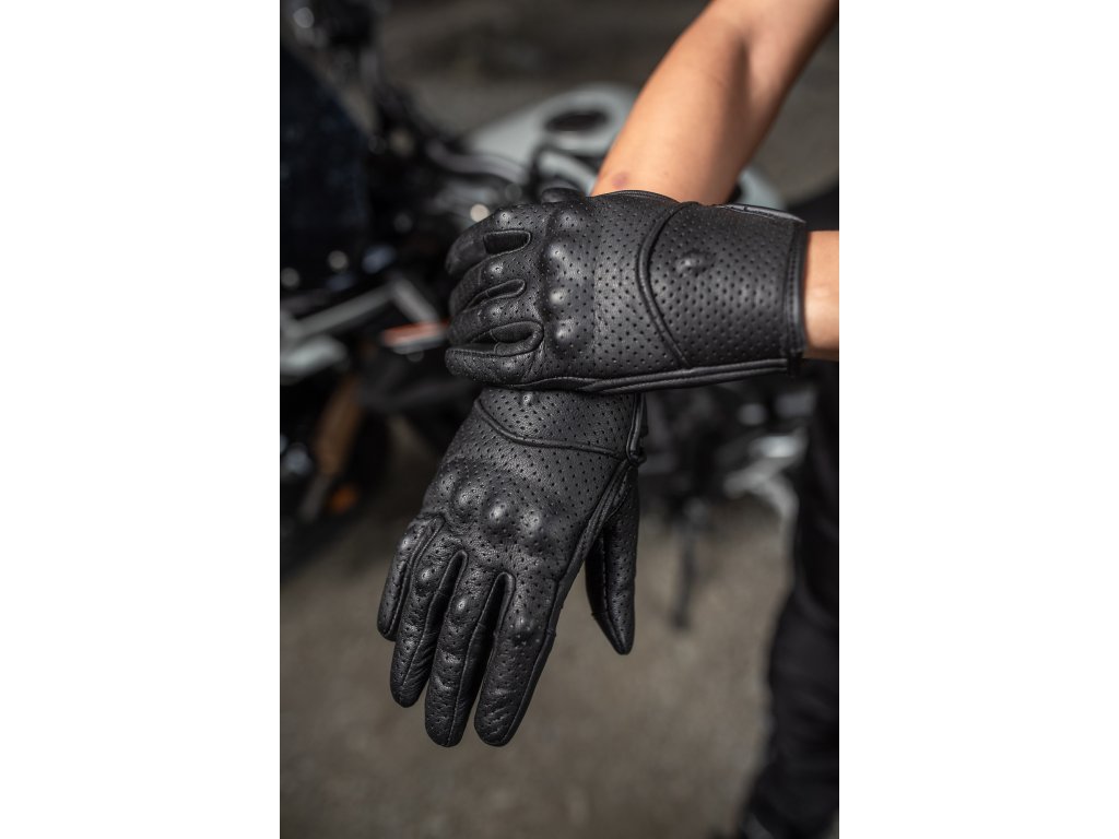 Materiálem je vysoce kvalitní kozí kůže, která je ušita bezpečnostními švy a na dlaních je zdvojená. Z vnitřní strany je použita podšívka ze 100% polyesteru pro maximální komfort. I tyto rukavice samozřejmě obsahují bezpečnostní prvky - konkrétně PU chránič kloubů a pěnové chrániče prstů. Chránič kloubů je pokryt vrstvou kůže, která jej "schová" a tím pádem není narušen unikátní styl rukavic. Upravitelnost na ruce zajišťují stahovací pásky na manžetách.