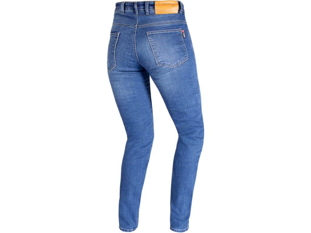Világoskék kevlár motoros farmernadrág hölgyeknek. A CE Level 2 tanúsítvánnyal rendelkező térdvédőket és a csípővédők behelyezésére való előkészítést tartalmazzák.