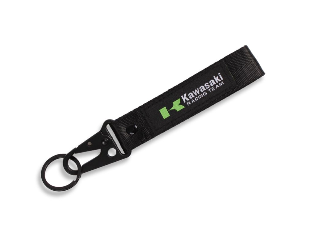 Klíčenka s karabinou Kawasaki z jedné strány nápis Kawasaki z druhé Ninja a z černého podkladu. Darujte přívěšek Kawasaki svému známému.