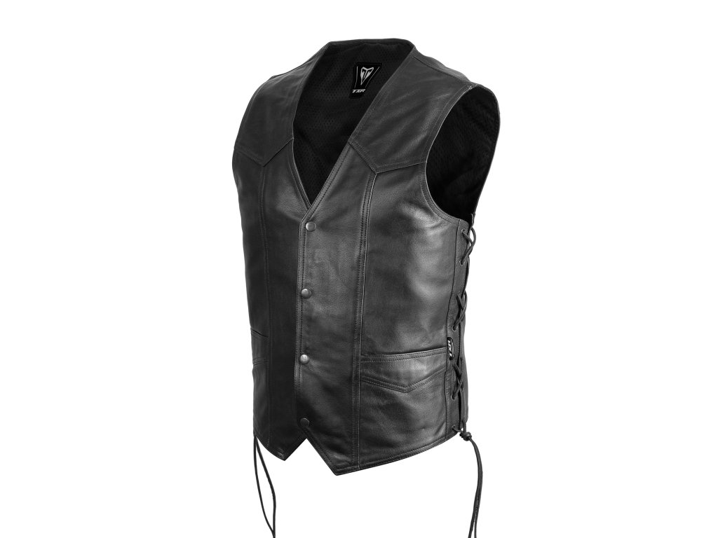 Kožená vesta na motorku TXR Road z hovězí kůže o síle 1,1-1,2 mm se zapínáním pomocí druků, 2 vnější a 2 vnitřní kapsy.