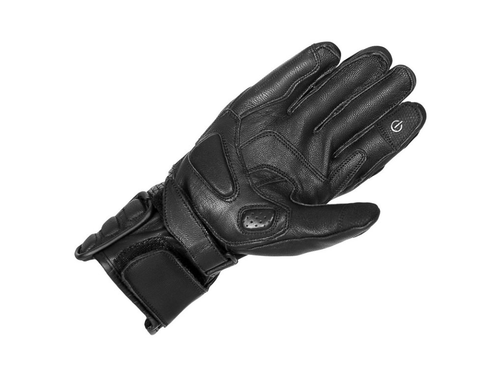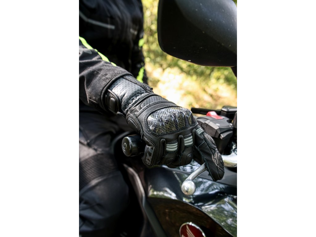 Sportovní moto rukavice s karbonovým chráničem kloubů a pěnovými chrániči prstů. SAS-TEC chránič dlaně a zdvojená malíková hrana.