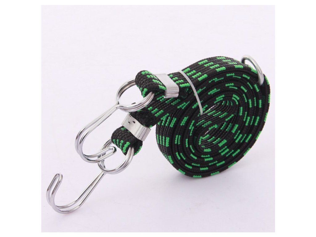 Plochá upínací guma ukončená háčky. Délka gumy 200 cm, šířka 23 mm. Maximální nosnost 20 kg. Otočné háčky z dvojitého drátu pro větší pevnost v tahu a snadné uchycení nákladu. Zaoblené konce háčků zabraňují poškrábání. Plochá guma pro ochranu nákladu.