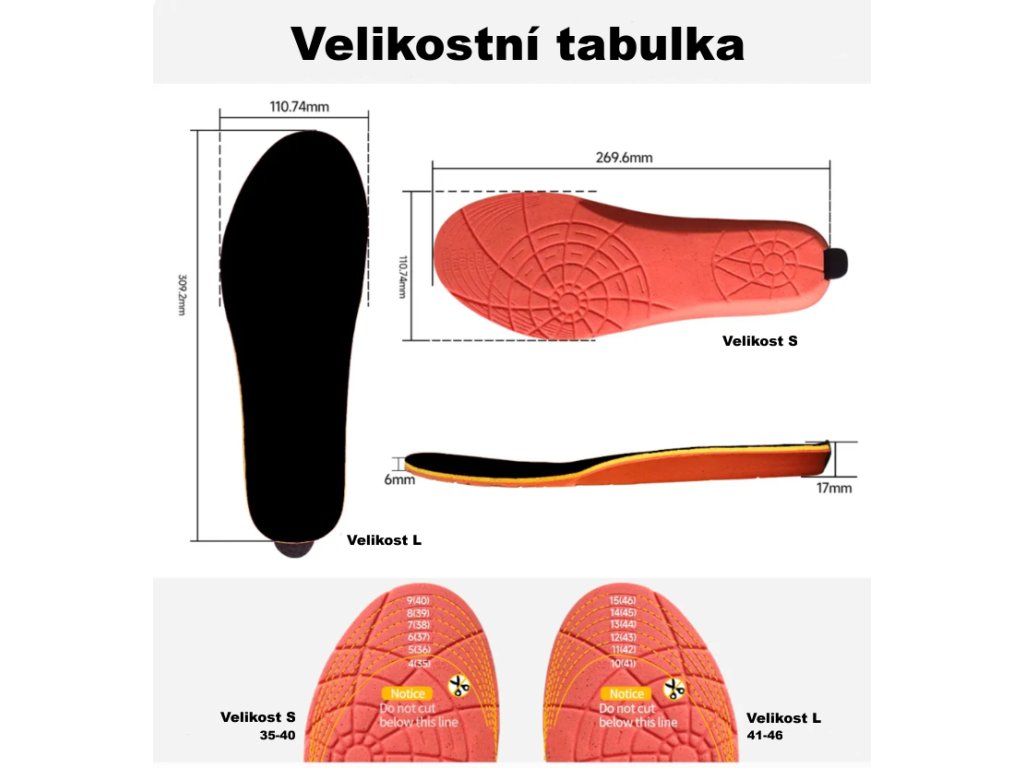 Tloušťka vložek je 15 mm v oblasti paty a 3 mm u prstů. Velikost lze přizpůsobit zastřižením podle vyznačených linií – menší varianta je vhodná pro velikosti 35-40 (230-269 mm) a větší pro velikosti 41-46 (269-309 mm).